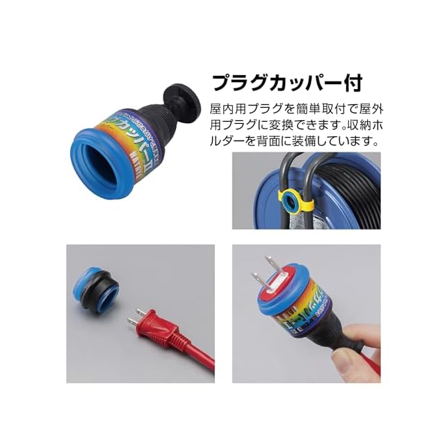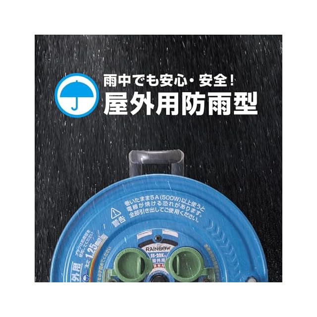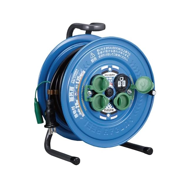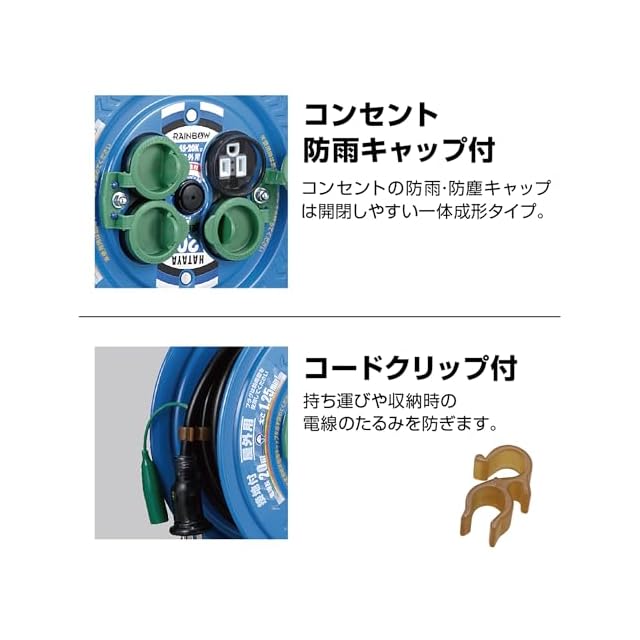 【特徴】サンデーリールベースの屋外用コードリールです。便利に使える防雨型のコードリールでコンセントの防雨・防塵キャップは一体成型タイプを採用しており、開閉が簡単です。Wコンセントを一体モールド成型し内部配線部への水の侵入を防ぐ、防雨型四ッ口コンセントです。プラグはアースピンのスライドにより2P/2P接地付コンセントのどちらにでも接続できる「フキュートビプラグ」を採用。ハタヤオリジナルの折り曲げフレームは、持ち運びやすいグリップを上部に、仰向けに置いた時に安定する凸部を背面部に一体に形成しています。屋内用プラグを簡単取付で屋外用プラグに変換可能なプラグカッパーを1個付属しており、収納ホルダーを背面に装備しています。
