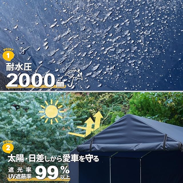 【耐水圧2000mm】耐水圧2000mmの全面カバーで耐久性と耐水性があるテントと同等の生地を採用し、一般的な傘の約4倍の耐水圧で愛車を雨から守ります。