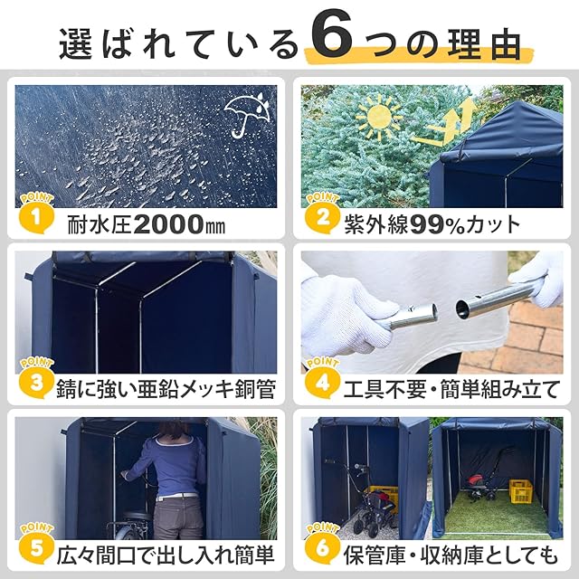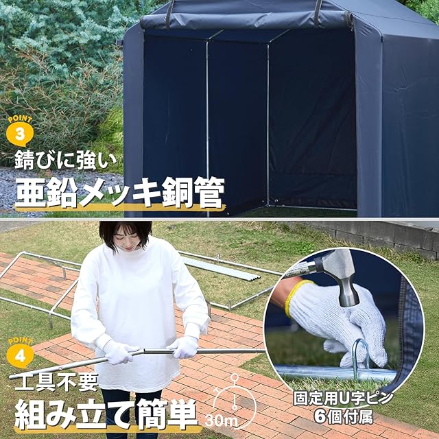 【こだわり】耐水圧2000mmの全面カバーで砂埃や雨から愛車を守る。錆に強い亜鉛メッキ鋼管を使用。
