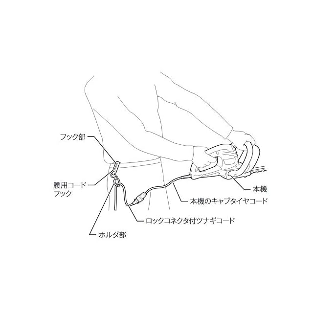 作業時のコード誤切断防止、「腰用コードフック」付