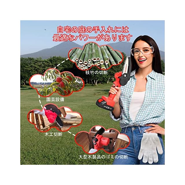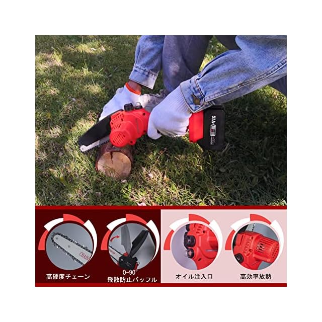 高い安全性:チェーンソー 充電式本体には制御回路基板と過負荷保護機能が内蔵されており、モーターが過熱するとチェーンソーは自動的にモーターを停止します。電動チェーンソーの使用寿命を延長いたします(注意:充電式チェーンソーは20分休憩すると継続的に使用できる)アップグレードされた「自動給油」設定により、小型チェーンソーの切断がスムーズになり、チェーンが引っかかなくなります。人間工学的な滑り止め設計により、グリップ部分は手にフィットします、また安全ロックにより電気チェーンソーの予期せぬ起動を防止できます(チェーンソーを開くには2つの異なるボタンを押して使用する必要があります)。効果的な通風と放熱設計はモーターの焼損を防止し、電池に電力を供給するミニチェーンソーの動作をより安全で安定させます。また90°バッフル設計とゴーグルにより、作業中に木くずや屑が目や顔に入らないようにすることができます。手袋も付属しております。