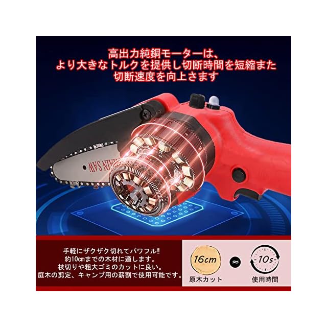 強力で高効率な切断:チェーンソー 充電式は880 Wの大出力純銅モーターを搭載、良質なガイドチェーン(深さ焼入れ処理)を採用し、長時間の使用においてもより大きなトルクを提供しそれによって摩耗を減少します。またツールの寿命を延長しわずか10秒で直径160 mmの原木を迅速に切断でき、時間の削減ができます。