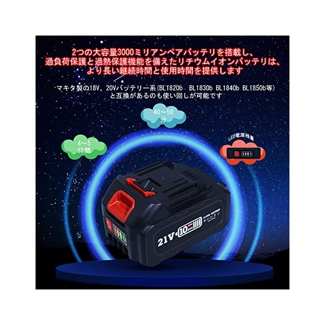 3.0Ahバッテリーを2個搭載:①マキタ製の18V、20Vバッテリー系(BL1820b BL1830b BL1840b BL1850b等)と互換が可能、使い回しができます。「他のブランドのチェーンソーの電池が切れたとき、替えのバッテリーだけ購入が難しそうですが、その頃にはチェーンソーも傷んでそうなので、本体ごと買い替え時期ということなのでしょう」 ②バッテリー残量がLEDでわかるのが便利です。③【安全性】高品質セル搭載で、耐久性が高く、長期間使用可能です。過電流、過充電、過放電防止の保護回路も内蔵しているので、安心してご使用頂けます。④バッテリーは通常4~5時間で充電できますが、 電動チェンソーはフル充電で40〜50分以上、正常に使用可能です。⑤バッテリー2個付きで、片方使っている間にもう片方を充電できて便利です。⑥バッテリーがグリップエンドに密着することにより安定したバランスが維持されます。