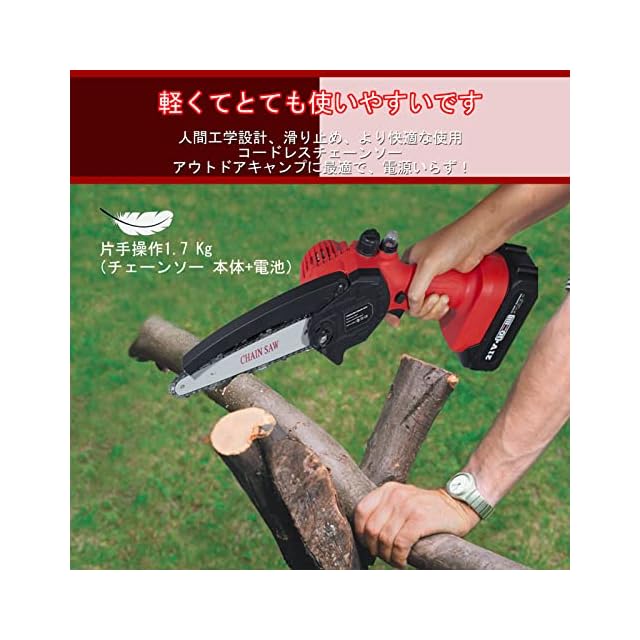 コンパクトで軽い:チェーンソー 充電式は軽量(電池を含めて1.7 kg)で小型なので、初心者に適しています。女性や高齢者にもおすすめです。電源コードを接続することなく使用できチェーンソーの多様化でき園の剪定、薪の切断、枝竹の切断、大型木製品のゴミの切断など、家庭での使用に非常に最適です。父、母、妻、夫、友人、DIY愛好家への素敵なプレゼントにいかがでしょうか。