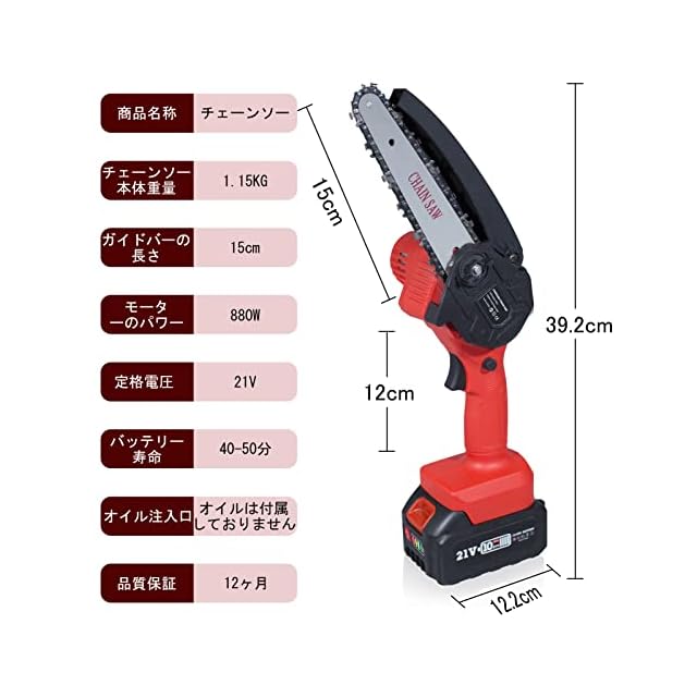 注:1.本製品は、チェンソー刃自動噴射機能が付いております。メンテナンスする際に、付属しているオイル充電用ボトルを活用してください。(オイルは別売り品です)、また本体のオイルを充電する際に、指で残量確認用透明PP窓を押してください。 2.電池内部の不活性化や過放電などを防ぐためにも2カ月に1度は充電を行うことをおすすめします。 3.リチウムイオン蓄電池をしばらく使用しない場合は、30%程度充電をして高温多湿、低温環境を避けて保管してください。 4.バッテリーは過熱保護システムの起動によって充電を停止された可能性があります。この場合、30分以上を冷却させてから充電して下さい。