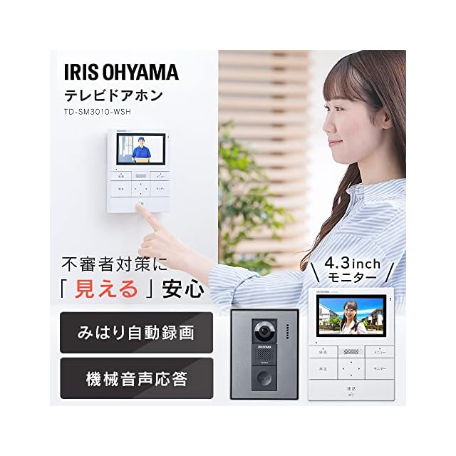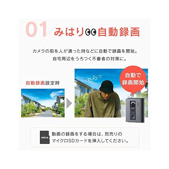 【いつでもどこでもスマホで応答】スマホがあれば、不在の時や手が離せない時でも応答・確認できる!<br>不在時の来客はもちろん、家族の帰宅状況まで。(※どこでもスマホで応答機能の利用には「HomeLink」アプリを使用して、スマートフォンとドアホン室内親機との連携が必要です。)【みはり自動録画】カメラの前を人が通った時などに自動で録画を開始。自宅周辺をうろつく不審者の対策に。(※動画の録画をする場合は、別売りのマイクロSDカードを挿入してください。)