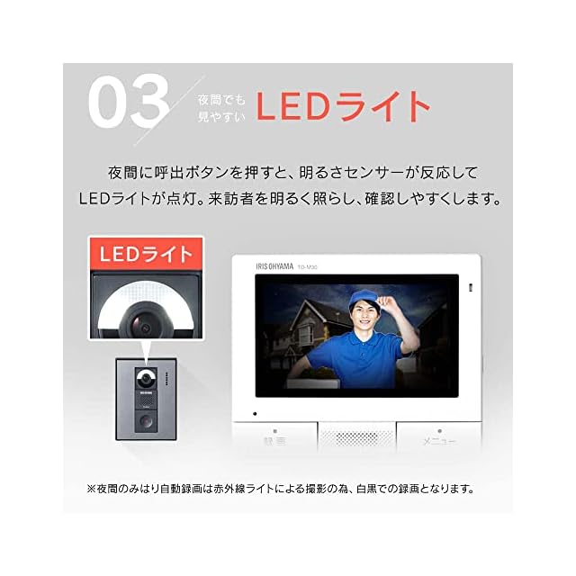 【夜間でも見やすいLEDライト】夜間に呼出ボタンを押すと、明るさセンサーが反応してLEDライトが点灯。来訪者を明るく照らし、確認しやすくします。(※夜間のみはり自動録画は赤外線ライトによる撮影のため、白黒での録画となります。)【広範囲を確認】左右画角約170°の広角レンズを採用。玄関を広い範囲で確認できます。【呼び出し音量】呼び出し音量を時間帯別に設定可能。日中は大きめ・夜間は小さめ等、調整できます。【かんたん操作】見やすいメニュー画面と、大きめボタンで操作しやすい。