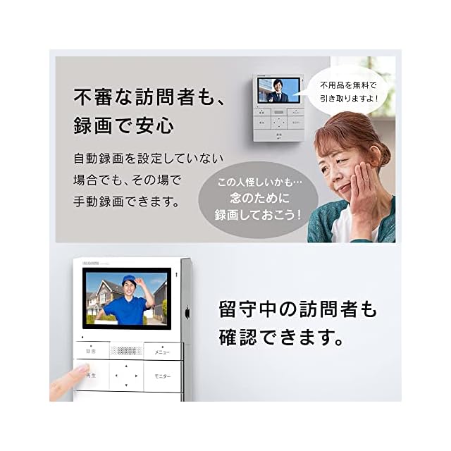 【動画でしっかり保存】玄関先の映像を自動または手動で録画。SDカード挿入時で、動画撮影最大1200件。SDカード未挿入時は、子機の呼出し操作をした際に静止画撮影(最大30件)し、保存します。【困ったときの機械音声応答】知らない訪問者へは、第一声を機械音声におまかせ。用件を聞いたうえで、不審な来客との会話を避けられます。