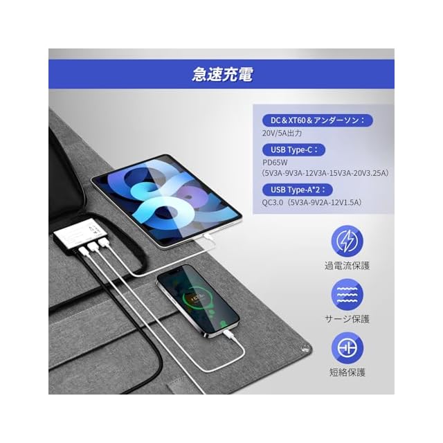 【DC100W&PD60W高出力&QC3.0で急速充電】3 in1 to DC5521(オス)・アンダーソン・XT60コネクタを搭載し、10種類のDC変換プラグが付属しているOTOUCH ソーラーパネルは市販の大部分のポータブル電源に対応できます。そして、USB-A*2(QC3.0出力:5V3A-9V2A-12V1.5A)・USB-C*1(PD65W高出力:5V3A-9V3A-12V3A-15V3A-20V3A)ののポートを搭載しており、スマホ、タブレット、PC、モバイルバッテリー、ポータブルなど幅広い機器の充電に対応できます。同時充電可能で地震などの災害の時は役に立ちます。(購入前手元のポータブル電源の入力ポートをご確認ください)