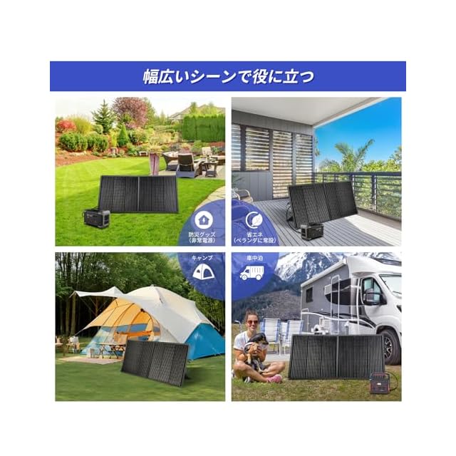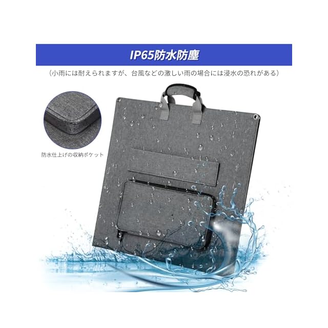 【IP65防水・アウトドア&防災対策】IP65防水レベルで防水防塵性能があり、外で安心して使用できます(小雨には耐えられますが、台風などの激しい雨の場合には浸水の恐れがある)。ポータブル電源と一緒に使用してキャンプ、車中泊、釣りや登山などのアウトドアシーンはもちろん、災害などで停電した際にも活用できます。数枚のソーラーパネルと直列・並列接続可能で用途に合わせてご利用いただけます(並列専用なケーブルは別途購入)。ご注意:発電量は設置場所、天候条件、日照時間等によって変動しますので、ご了承ください。
