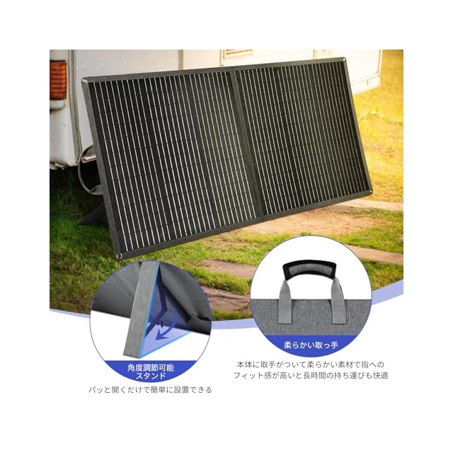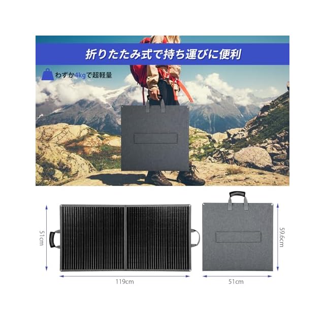 【折りたたみ式・超軽量】45°〜90°調節可能の自立スタンドがソーラーパネル後ろについており、面倒なセッティングがなく広げるだけでさっさと使えます。折りたたみ式でスペースを占めずスリムに収納できます。収納サイズは510*596*45mmで展開サイズは1191*510*30mmで重量はわずかの4kgでコンパクトです。本体に取手がついて柔らかい素材で指へのフィット感が高いと長時間の持ち運びも快適です。