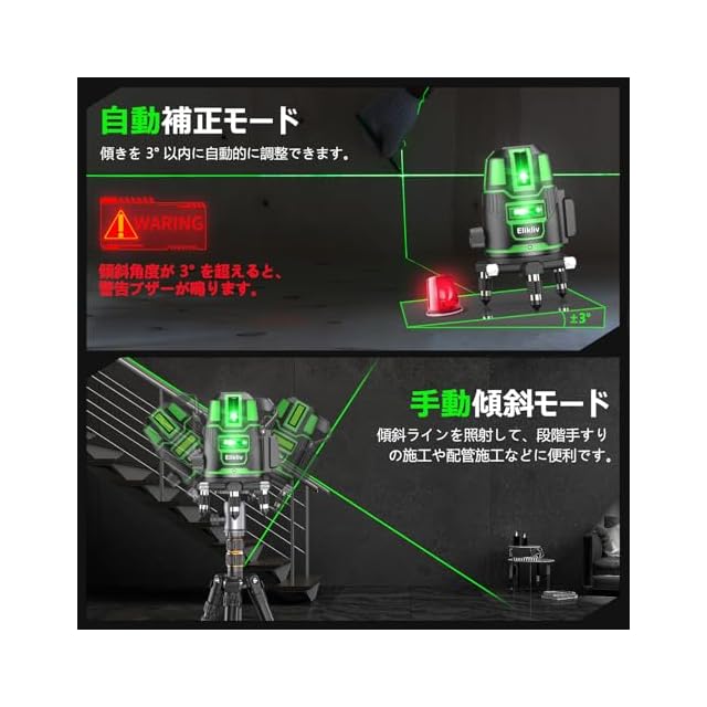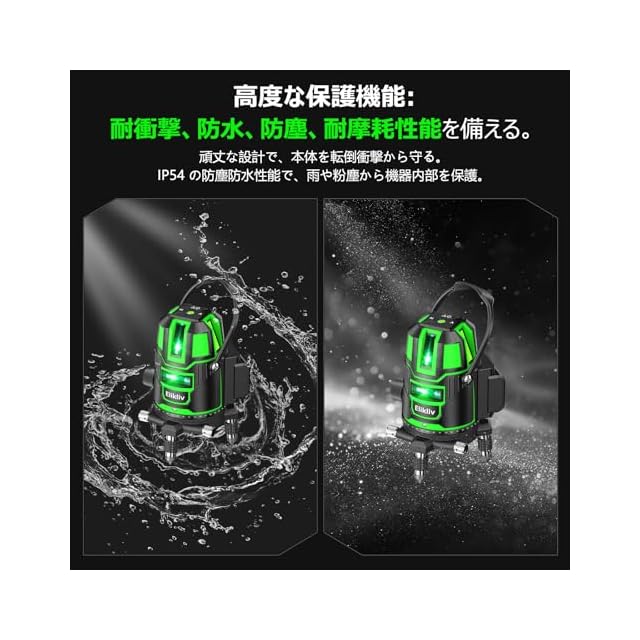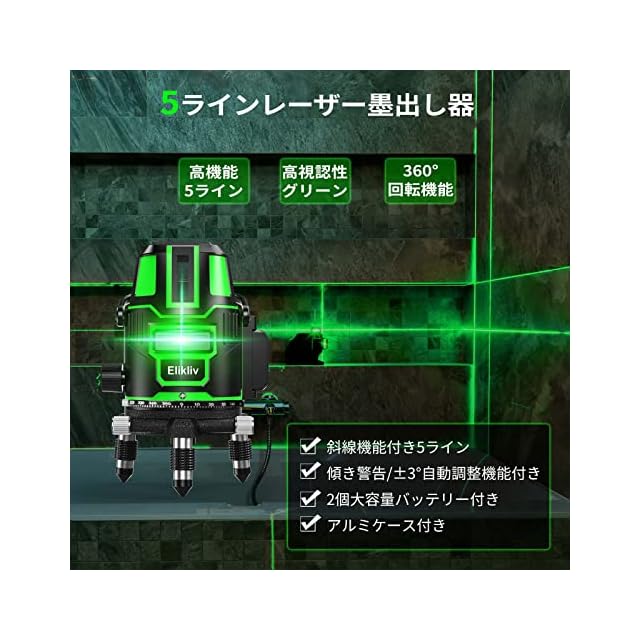 Elikliv レーザー墨出し器 レーザー 水平器 レーザー レベル グリーン 5ライン 4方向大矩照射 360°微調整 大容量バッテリー2個 高輝度 高出力 自動補正 軽天作業 測量建築 DIY 軽量 小型 屋内屋外 アルミケース付き 型番:B5