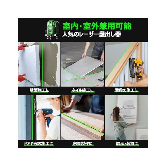 ✅【製品仕様】光源:緑色可視半導体レーザー 520nm。レーザー基準:クラス 2。水平精度:± 1mm/5m。垂直精度:± 1mm/5m。直角精度:±90°±0.1°。ライン幅:1.5mm/5m。動作時間:約 8 時間(全照射時)。仕事温度:-10℃~+50℃。防塵防水グレード: IP54。使用場所:室内、室外。
