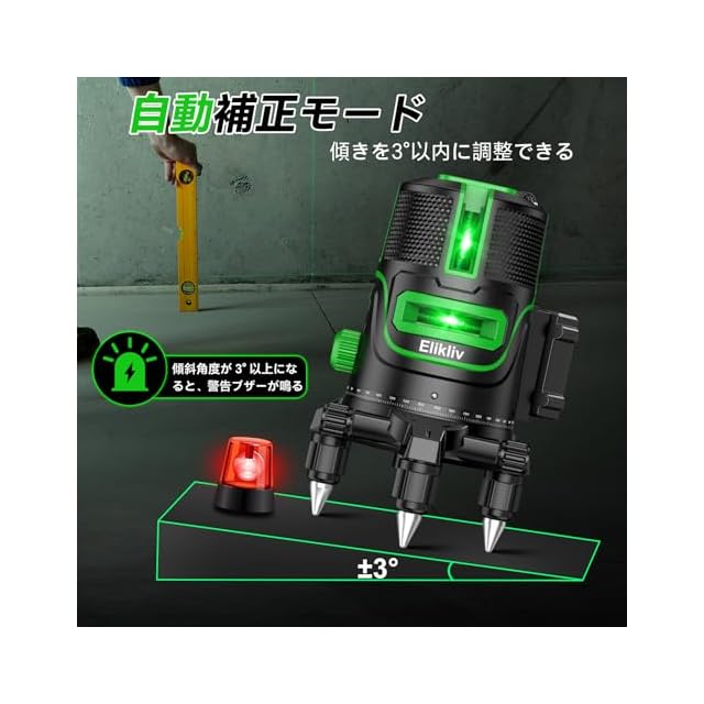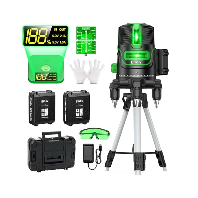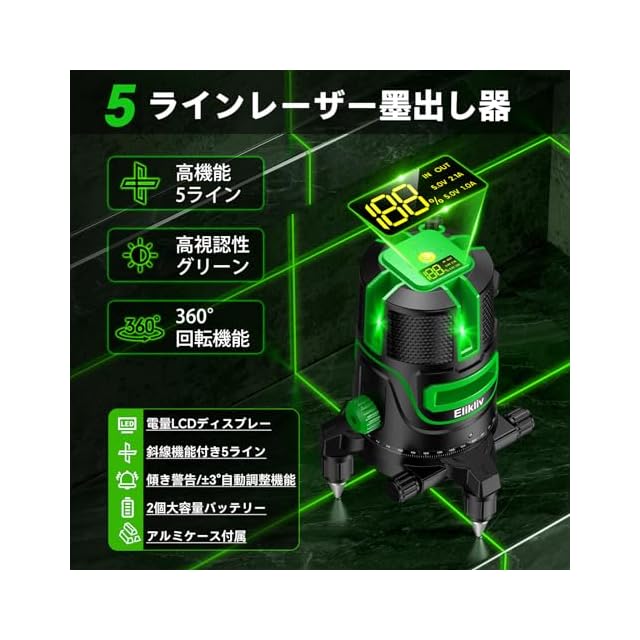 【2025最新改良】Elikliv レーザー墨出し器 グリーン 墨出し レーザー 5ライン 電量LCDディスプレー搭載 レーザー墨出し器三脚付き グリーン レーザー水平器 5ライン 5線6点 レーザーレベル 大型アルミ三脚 高輝度 高出力 軽天作業 タイルの張替え 建設 建築 DIY バッテリー2個・エレベーター三脚・ケース付き 型番:R5 Pro