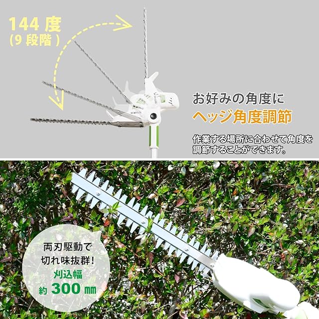 【特徴】ガーデントリマー&ガーデンソー の4WAYセットです。これ1台あればお庭のすべての剪定作業が快適に!ヘッドやポールを取り換えるだけで4つの剪定作業ができます。<ガーデンポールトリマー>刈り込み幅約300㎜の両刃駆動で切れ味抜群です。スムーズな刈り込みを実現しました。伸びきった生垣の剪定に最適です。作業する場所に合わせて、144度(9段階)でヘッジの角度を調節することができます。また着脱式伸縮延長ポールの着脱伸縮によって短縮時約130cmから最長約300cmの高さに合わせることができます。下草も立ったまま刈れるので作業がとても楽ちんです。簡単に着脱できる伸縮ポールだから収納もコンパクトにできます。またお家以外の場所で使う時も持ち運びやすく、ブレードカバーも付いているので安全で便利です。充電切れの心配なしAC電源タイプでパワフルにお使いいただけます。