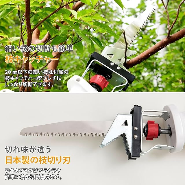 【特徴】<ガーデンポールソー>刃をあてるだけでラクラク簡単に枝を切断出来ます。また衝撃焼入によりヤスリよりも硬くなりますので、丈夫な刃先で耐久力が数倍アップしています。20㎜以下の細い枝は付属の枝キャッチャーで、ブレずにしっかり切断できます。着脱式伸縮延長ポールの着脱伸縮によって短縮時約130cmから最長約300cmの高さに合わせることができます。切断した枝のカットなどは短縮時での使用が最適です。始動させる際は安全ボタンを押しながらスイッチを握ります。もちろん作業中はスイッチのみでご使用いただけます。トリガースイッチでスピード調節も可能です。
