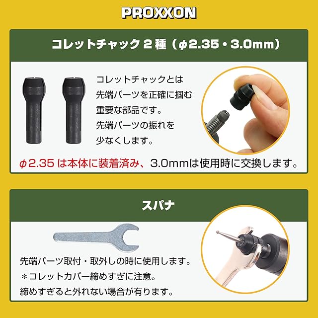 付属品:コレットチャック(径2.35・3.0mm用)・スパナ・フレキシブルシャフト・超硬ビット台形型1.6mm・ハイスビット三角型2.1mm・ハイスビット3.1mm棒型・ハイスビット5.0mm・軸付き砥石WA・C砥石各1本・ビット用ケース・収納ケース