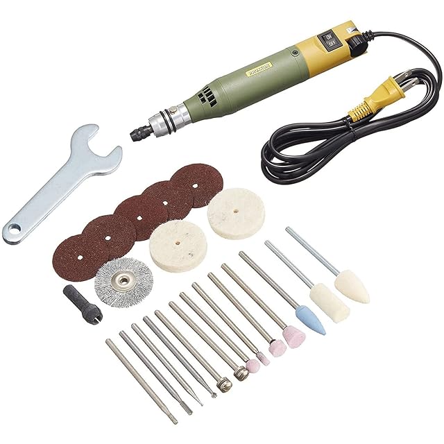 セット内容:ミニルーター本体・収納ケース・コレットチャック2.35/3.0mm用(各1個)・ダイヤモンドビット2種(各1本)・ハイスビット2種(各1本)・純毛バフ(軸付き)2種(各1本)・純毛バフ(ディスク)2枚・軸付き砥石(WA)4種(各1本)・シリコンバフ1本・切断砥石5枚・ワイヤーブラシ(鉄)1枚・専用シャフト2本・専用ビットケース1個・ツールスタンド 1個・スパナ 1本