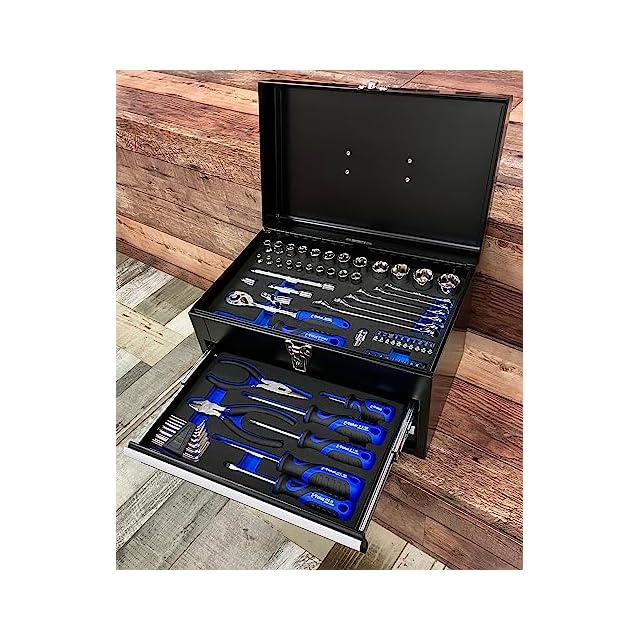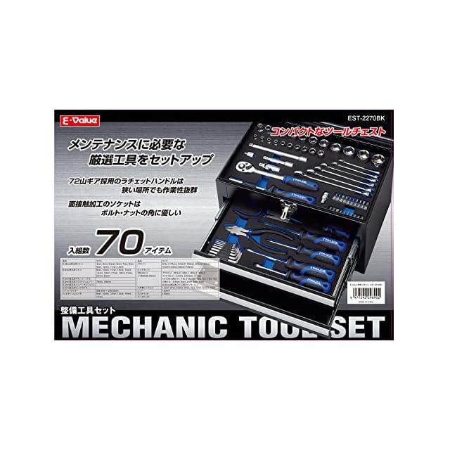 イーバリュー(E-Value) 整備工具セット ツール70点+ツールチェスト ブラック EVAマットトレー仕様 各種メンテナンス対応 バイク 自動車 DIY 日曜大工向け EST-2270BK | つむぎ屋