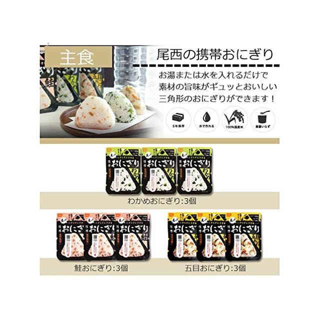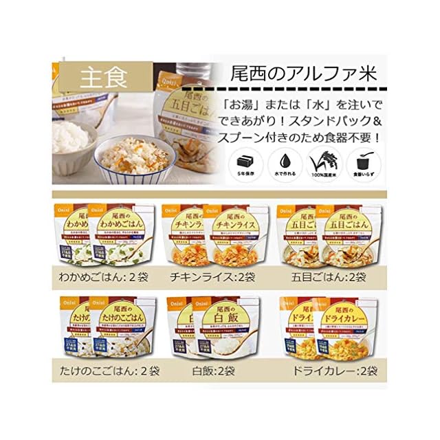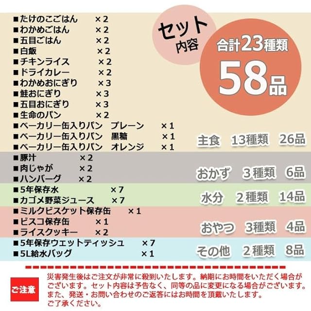 こちらは非常・保存食23種類58点セットです。<br> おひとり様、約7日分の非常食として。<br> ご家族分として。<br> 賞味期限の近いものの、詰め替え用として。<br> キャンプ、アウトドアでの使用に。<br> お友達、ご近所様と分け合い。<br> 企業様、自治体などの備蓄用に。<br> 製造より5年保存可能! ※流通の段階で多少のお時間がかかるため、お手元に届く際には賞味期限が5年を切る場合もございます(賞味期限4年以上を) アルファ米、ごはん、おにぎりは、<br> お湯で約15分、水で約60分でおいしいごはんが出来上がり。<br> すべて国産米を使用し、非常用持ち出し袋などにセットしたり、キャンプなどでもお使いいただける 美味しく手軽なごはんです!<br> 缶入りパンもふんわりおいしく、避難先で心が安らぐビスコ、クッキーなどのおやつも入っています。<br> ライスクッキーはパティシエ監修で、非常食とは思えないおいしさです!<br> 非常用持ち出し袋の中に追加したり、ご家族用にご用意される時にぴったりの単品販売となります。 <br>アウトドア、キャンプでもお使いいただけます! <br> -セット内容-<br> ●保存水×7<br> ●野菜ジュース×7<br> ●五目ごはん×2<br> ●わかめごはん×2<br> ●たけのこごはん×2<br> ●白飯×2<br> ●チキンライス×2<br> ●ドライカレー×2<br> ●鮭おにぎり×3<br> ●わかめおにぎり×3<br> ●五目おにぎり×3<br> ●生命のパン×2<br> ●ベーカリー缶入りパン(プレーン)×1<br> ●ベーカリー缶入りパン(黒糖)×1<br> ●ビスケット×1<br> ●ベーカリー缶入りパン(オレンジ)×1<br> ●豚汁×2<br> ●肉じゃが×2<br> ●ハンバーグ×2<br> ●ビスコ×1<br> ●ライスクッキー×2<br> 水・非常食 合計21種類50点と、<br> ●5年・ウェットティッシュ×7<br> ●非常用・給水バッグ×1<br> 総合計58点のセットとなります。<br> ■原産国:日本 <br> -ご注意-<br> ■災害発生後はご注文が非常に殺到いたします。納期にお時間をいただく場合がございます。セット内容は予告なく、同等の品に変更になる場合がございます。<br> また、・お問い合わせのご返答にはお時間を頂戴いたします。ご了承ください。<br> ■商品サイズ・カラーは、企画サイズとなります。<br> ■商品画像につきましては、モニターの種類・設定等により、実際の商品とは素材感や色味が異なる見え方をする場合があります。<br> ■細かなキズや、製造上避けられないシミ・シワなどがある場合があります。<br> ■商品仕様は、予告無く仕様変更される場合がございます。また、セット内容は予告なく同等の品に変更になる場合がございます。予めご了承下さい。<br> ■商品によっては、他店と在庫共有しているものがございますので、ご注文を頂戴した時点で、 在庫が確保できない商品につきましては、<br> ご注文をキャンセルさせていただく場合がございます。 なにとぞ、ご了承の程、よろしくお願いいたします。