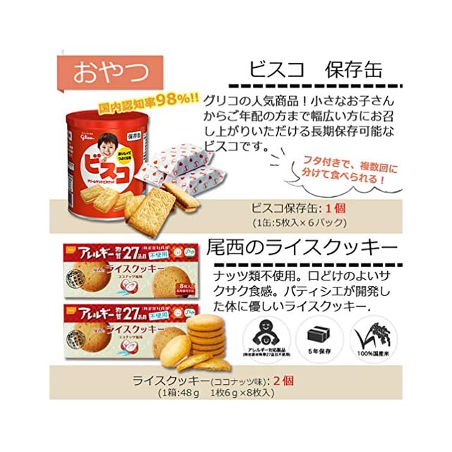 避難先で心が安らぐビスコ、クッキーなどのおやつも入っています。