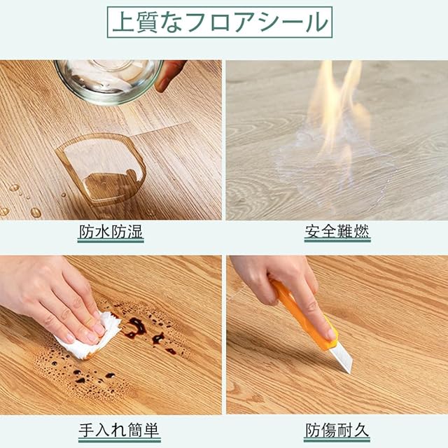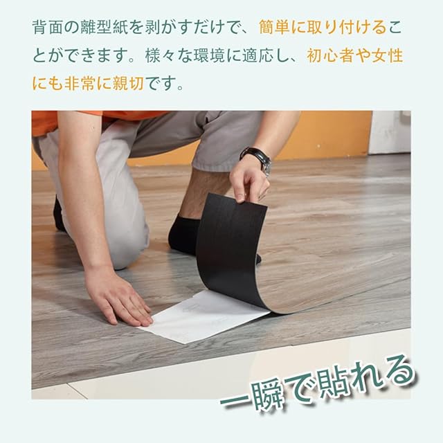 【貼るだけで簡単・DIY可能】背面の透明フィルムを剥がすだけで、付属の強力な接着剤で簡単に床に固定できます。追加の接着剤や工具は不要で、初心者や女性でも簡単に施工でき、自由にカットして場所に合わせて調整できます。(注:シール跡は「のり取りクリーナー」で拭き取れます。完全回復を希望する場合、貼る前にCFシートや養生テープを使用することをお勧めします。)
