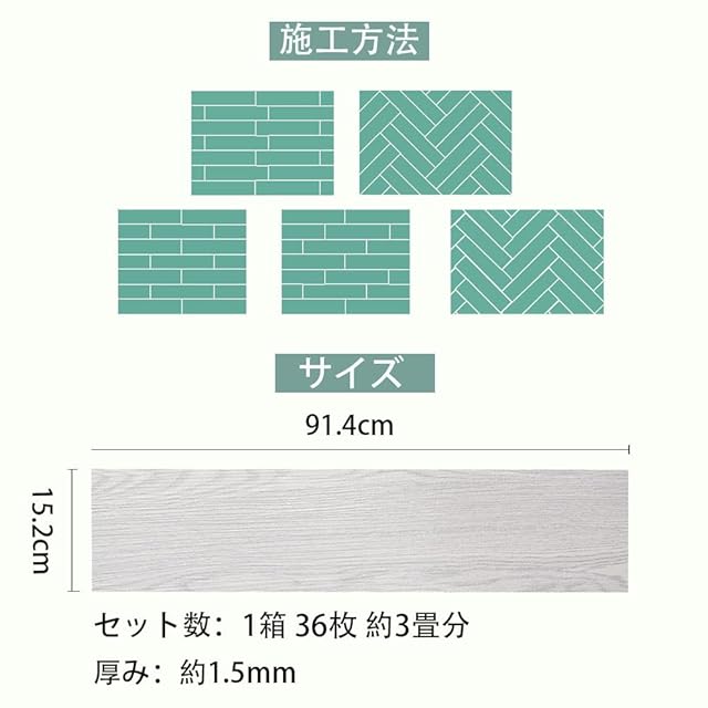 【商品仕様】一枚長さ:約91.4cm×15.2cm、厚み:約1.5mm。セット数:1箱 36枚 約3畳分 重量:1セット 約15KG