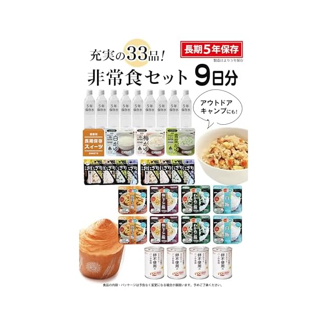 ✅【家族用としても使える9日分!】この非常食セットは33品9日分の大ボリュームです。ご飯からお菓子(パンなど)まで、幅広い年齢層に対応した多彩な備蓄食料を取り揃えています。またこの長期保存食は5年保存可能であるため、災害用の保存食だけでなくアウトドアやキャンプなど、様々なシーンで活躍します。ご家族皆様の健康を考えた当社の非常食セットをおすすめします。