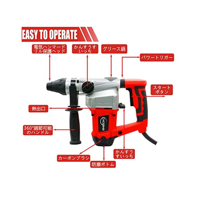 【注意事項】①ハンマードリル一定時間正常に動作したあと、机械が働かなくなったら、カーボンブラシを交換してください。②側面のスイッチ(円型)を最初は回すのが硬い可能性があります。力を過度にかけて回すとスイッチが破損する恐れがあります。まずは円型スイッチを真ん中まで回して、onスイッチを軽く押して機械を起動し、そのまま円型スイッチを回させ続けると設定が完了します。③機械の力が弱まったら、シリンダーにシリンダー油脂(耐熱性)を入れてください。④ハンマー機能が使用できない場合は、潤滑脂がシリンダーリンクで凝固しているためです。機械を起動して、熱くになると潤滑脂が溶けします。シリンダーが動作を回復し、ハンマー機能が使えるようになります。⑤長時間連続して動かさないでください。25~30分作業後休ませて放熱を行います。そうしないと過熱して焼ける可能性があります。もし不明なところがございましたら、弊社にご連絡してください、お願いします。