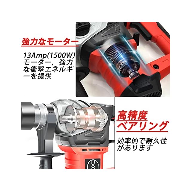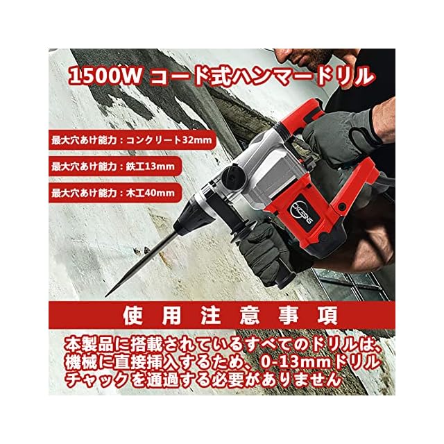 商品名:CXCESNS ハンマードリル 電動ハンマドリル 1500W 強力 100V コード式 SDSプラスシャンク 電動 ドリル 低振動機構 3モード コンクリートφ32mm/鉄工φ13mm/木工φ40mm 電気ドリル 電気ハンマ 金属 木材 石材 壁 穴あけ 収納入れものと手袋を贈る 日本語の取扱説明書が付属