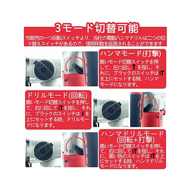 【3モード切替可能】用途に応じて「回転」「回転+打撃」「打撃」に自由に切り替えます。木材、金属、セラミックタイルなどの穴あけ、壁と地面の解体、様々な作業に最適です。市販売の一つ回転スイッチより、当社の電動ハンマドリルは二つの切り替えスイッチのデザインで、使用年数を延長されることができます。