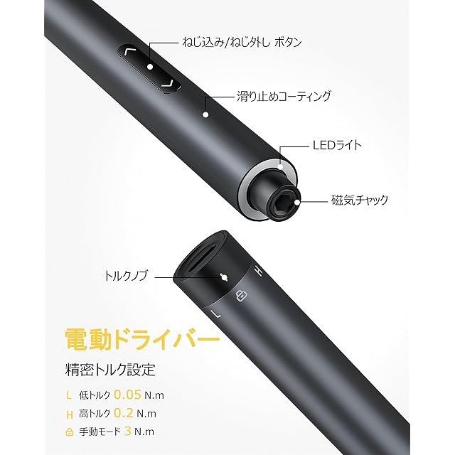 作業時間の半分で確実な効率: 電動精密ドライバーを装備しているため、電子ガジェットのメンテナンスにかかる時間は通常の半分です。0.05N.mと0.2N.mの二つトルク設定と最大3N.mの手動設定により、多用途性に優れています