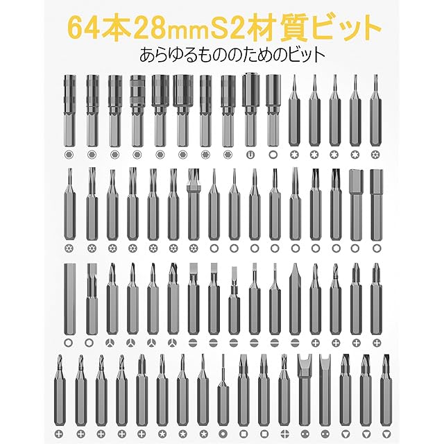 64本ビット+12種類の工具セット: S2鋼とニッケルメッキで作られた64本の精密ドリルビットを備えており、耐摩耗性、耐酸化性、耐腐食性、丈夫で耐久性があります。さらに、開口バチ、静電気防止リストストラップ、ハルバードスパッジャー、組立かなてこ、フレックスエクステンション、リバースピンセット、角度付きピンセット、吸引ハンドルなど12種類の電子メンテナンスツールを搭載しておりまあす。携帯電話、ノートパソコン、プレイステーション、スイッチ、カメラなどのほとんどのガジェット電子製品のメンテナンスに非常に適応します