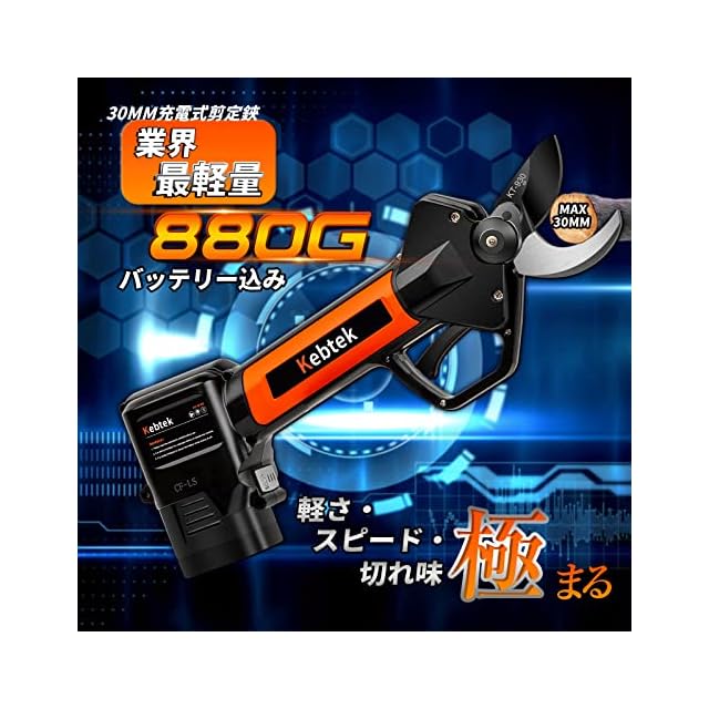 商品名:【軽量880g・日本製フッ素刃】Kebtek 電動剪定バサミ 16.8V コードレス 充電式剪定ばさみ 2500mAhリチウム電池2個付き 電動枝切り鋏 【0.4秒高速切断】プロ 剪定鋏 園芸 造園 果樹園 剪定工具 日本語取扱説明書付き 切断径30mm 品番KT930