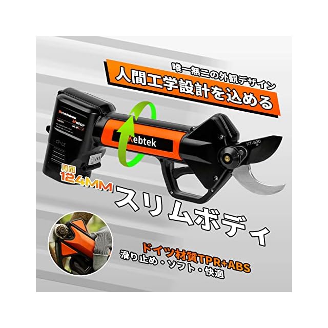 【こだわりの外観デザイン&人間工学設計】:Kebtek電動枝切り鋏のハンドル部分はドイツ材質TPR+ABSを採用しています。滑り止めだけでなく、ソフトでコンパクトボディで取り回し快適。長時間使用しても手に負担がかかりません。