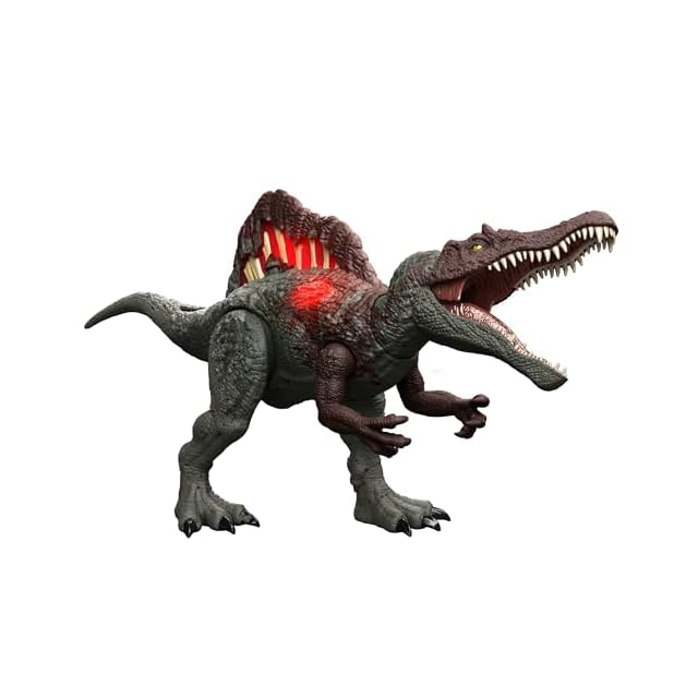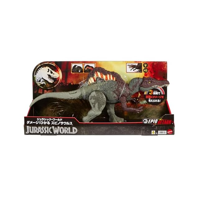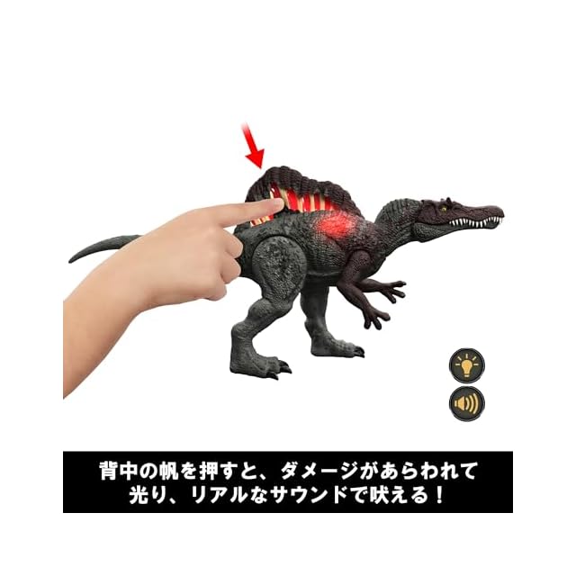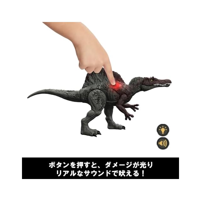 【内容】からだのボタンを押したりうでを持ち上げると、ダメージが光ってほえるスピノサウルスのフィギュア。ダメージは3段階で与えることができ、異なる声でほえます。さらに背中の帆をたたくとダメージがあらわれて光、サウンドが鳴ります。フィギュアと連動する無料アプリ「ジュラシック・ワールド・プレイ」に対応しており、DNAコードをスマートフォンでスキャンすることで恐竜をコレクションできます。