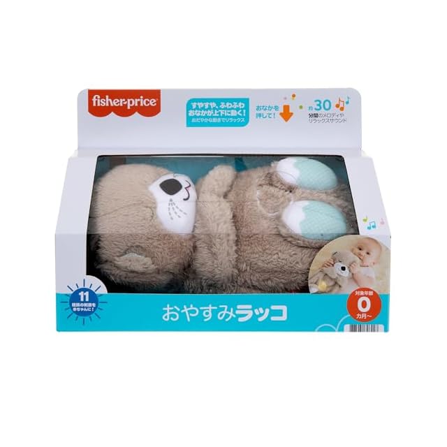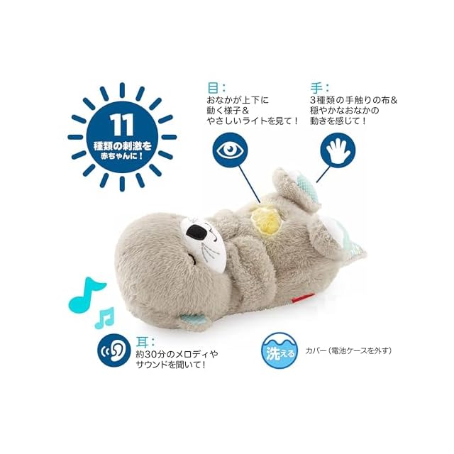 ふわふわラッコのおなかがゆっくり上下に動いて、ほんのりライトアップ!赤ちゃんが落ち着く心音や自然のサウンド、リラックスできるメロディを選べます。11種類の刺激を赤ちゃんに。手:3種類の手触りの布&穏やかなおなかの動きを感じて! 目:おなかが上下に動く様子&やさしいライトを見て!耳:約30分間のメロディやサウンドを聞いて!