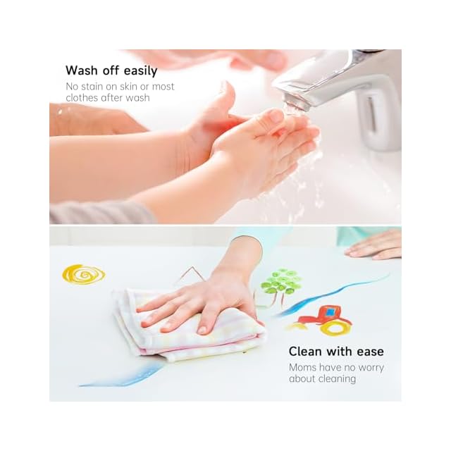【安全で洗える】安全な材料で作られて、無毒、無酸で環境にやさしいし、いやなにおいはしません。USA品質安全規格ASTM D- 4236とEN71基準も適合しています。水性絵の具なので、肌や衣類についても水で簡単に洗い流せます。落ちにくい場合なら、石鹸できれいに洗い落せます。穴なしのサーフェイスで使ると染みがなし、描いた跡は濡れたタオルで、均一にきれいで拭き取ることができます。表は多孔質の材料ならば、洗剤できれいに洗えます。ママも安心して、のびのび自由にお絵かきをさせてあげられます。※口に入る危険がありますので、3歳未満のお子様には絶対に与えないでください。