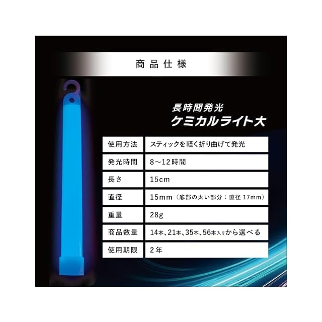 ✅【商品仕様】本製品はブルー 14本セット ペンライトです。サイズ:長さ 約15cm、直径(底部の一番太い部分17mm)。長期保存可能なファスナー付きアルミ袋入り、使い終わらず余ってもしっかり保管できます。【使用方法】①ケミカルライトの両端を両手で掴み、ポキッと音がなるまで軽く折り曲げて下さい。②中の液体が全体に行き渡るまで軽く振って下さい。