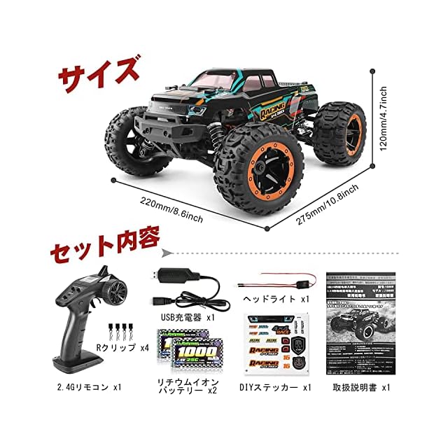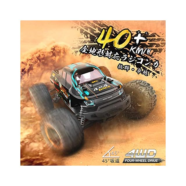 【パワフルでスピーディな 全地形対応 ラジコン オフロード モンスタートラック 】ラジコンカー オフロード、高いシミュレーション、分解が簡単。RTRモンスタートラックを搭載する前のような、今までにないオンとオフロードを楽しむことができます。内蔵電動380モーターで、強力なパワー、最大40KM/Hの速度制限を解除できます。フル機能のデジタル2.4GHzトランスミッタを搭載、低速/高速スイッチ、初心者向け低速、経験豊富なユーザ向け高速。