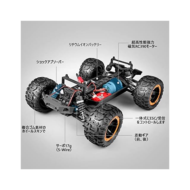 【強力なモーターと四輪駆動ラジコンカー こども向け オフロード】高いシミュレーション、分解が簡単。超高性能強力磁気RC390モーター、強力なパワー、スピードは40km/hにいたり。フロント/バック独立サスペンションシミュレーション技術はより多くの楽しさと経験をもたらします。高品質ゴムタイヤと合金材料で作成して、強い衝突抵抗と、振動による損傷を効果的に防ぎ、車内の部品を守れます。高地から落下しても壊れない耐衝撃性の高いボディを備えています。室内はもちろん、砂浜、芝生、45°坂道、岩や大理石などの道で問題がなし、簡単に操作して楽しめます。