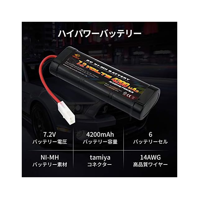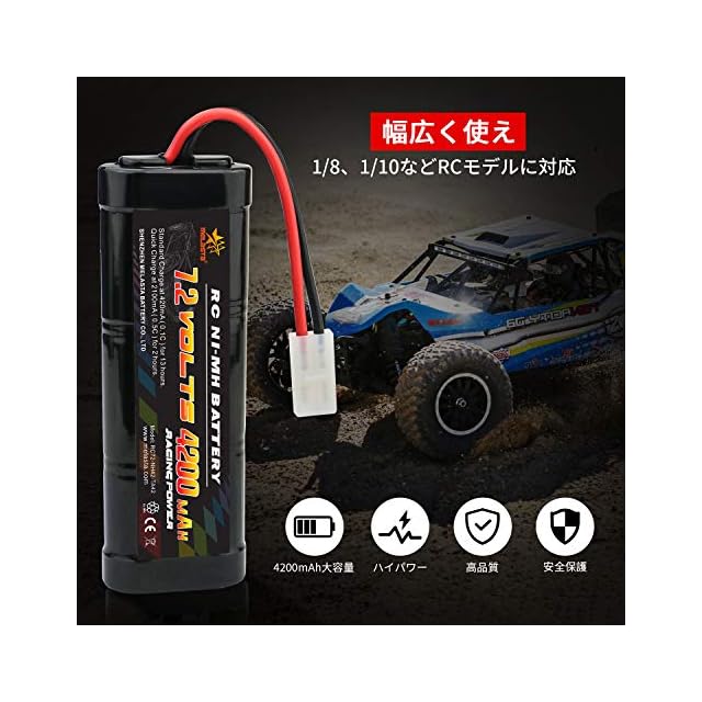 【幅広い互換性】1/8や1/10RCカー用の7.2Vニッケル水素バッテリーです。急速充電に適し、優れた放電特性を持つとともに十分な容量を確保しました。扱いやすいパワー特性を持ち、ビギナードライバーに最適。、オンロードカーからオフロードバギーまで車種を選ばず幅広く使えます。