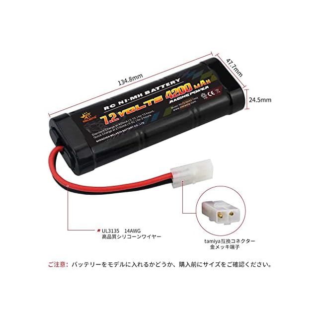 【商品仕様】素材:ニッケル水素 電圧:7.2V 容量:4.2Ah ワイヤーゲージ:14AWGシリコンワイヤー プラグ:tamiya互換タイプ金メッキ端子 サイズ:134×47.6×24.4mm 重量:約420g