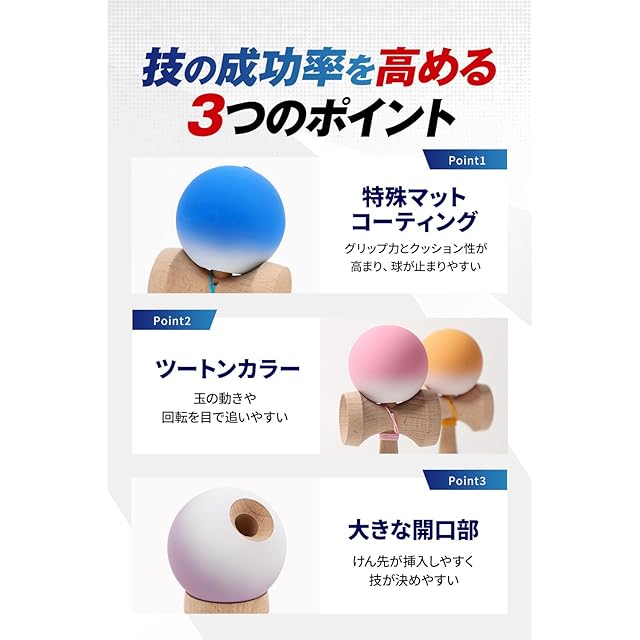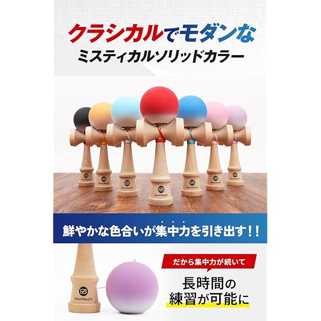 【技が決まる!競技用けん玉】✅ Heart Beat's けん玉は、技の決まりやすさを追求した高品質な競技用けん玉です。初心者から競技志向者、幼児・小学生、子供からお年寄りまで幅広いレベルの方にお楽しみいただけます。基本技から応用技まで、多彩な技に挑戦できる設計です。✅特殊マットコーティングにより、グリップ力とクッション性が高まり、球が止まりやすくなります。✅ツートンカラーにより球の動きや回転を目で追いやすく、技の成功率が高まります。✅大きな開口部により、けん先の挿入が容易になり、技の精度がさらに向上します。