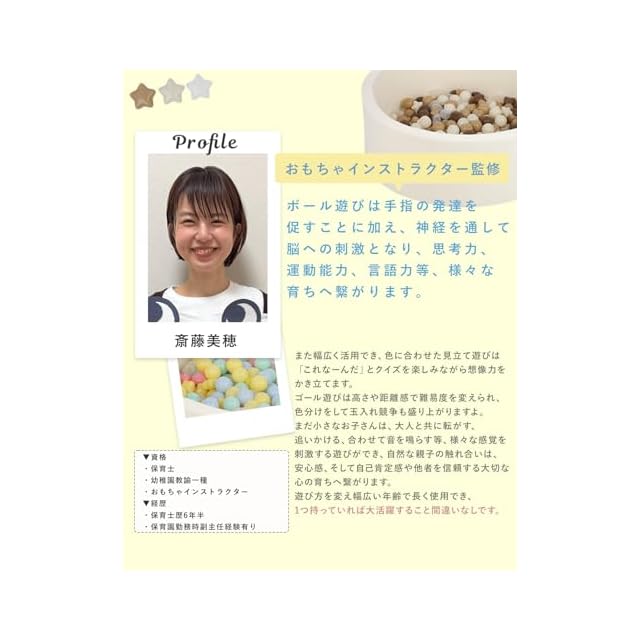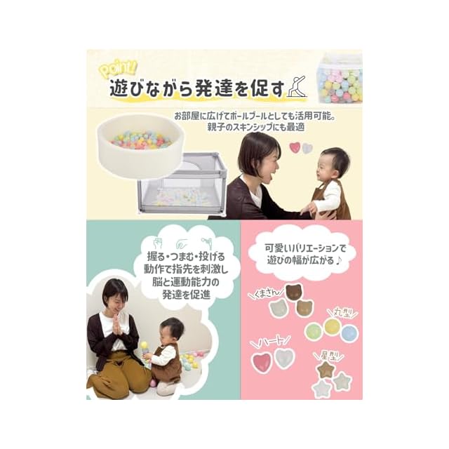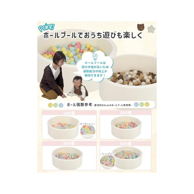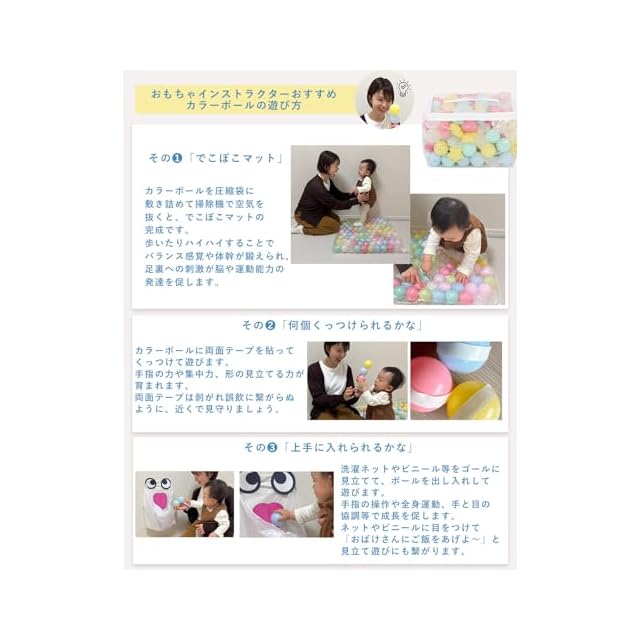 【遊びながら発達を促すカラーボール】指先を使うので脳に刺激を与え、発達を促します。ボールを投げて遊ぶことでコントロール力を育てます。・ボールプールは遊びの幅が広いため運動能力の向上が期待できます。