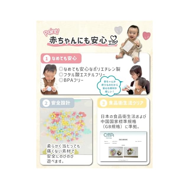 【赤ちゃんが安心して遊べるボール】くま形は直径5.7cm、ハート形・星形カラーボールは直径6cmなので赤ちゃんの小さな手でも握りやすい大きさです。また口に入れることができない大きさなので誤飲の心配がありません。なめても安心なポリエチレンを使用。柔らかいので体にボールが当たっても痛くありません。ボールをギュッと押してへこんでも元に戻ります。中国国家標準規格GB規格(中国版JIS)クリア済み。食品衛生法クリア済。フタル酸エステル、BPAは使用していません。