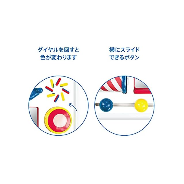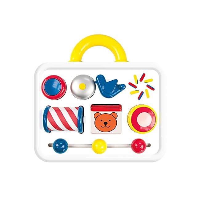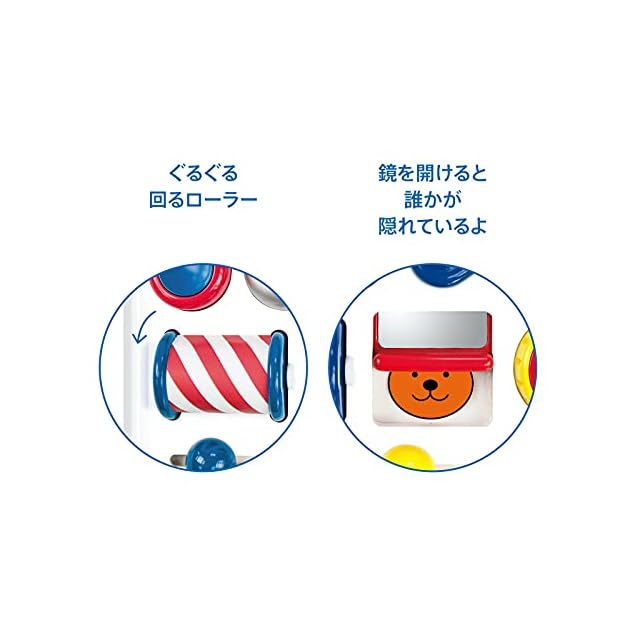 【遊具の種類】1ボタンを押すと音が鳴る 2鳥をはじいてベルを鳴らす 3ダイヤルを回すと色が変わる 4鏡を上げるとクマが隠れている 5くるくる回るローラー 6スライドできるボタンの6つの機能で赤ちゃんを飽きさせない知育玩具です。