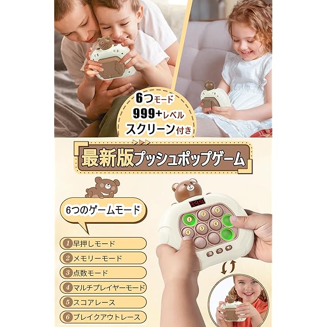 【最新版プッシュポップ ゲーム】6つのゲームモード、999+レベル、スクリーン付き。このおもちゃには、「ブレイクアウトモード」、「メモリーモード」、「スコアモード」、「マルチプレイヤーモード」の4つのモードをベースに、「スコアレース」「ブレイクアウトレース」の2種類の時間制限付き対決ゲームモードが追加され、ゲームの交流性がより際立ち、より刺激的になりました。各モードには異なる難易度が設定されており、子供たちは難しいレベルから達成感を得ることができます。