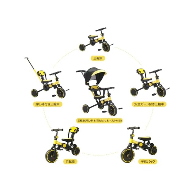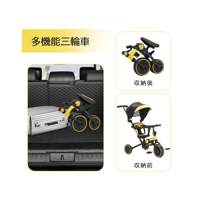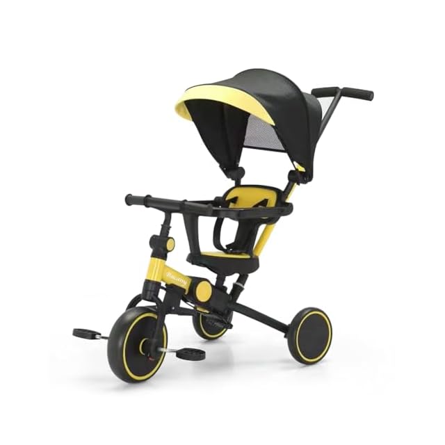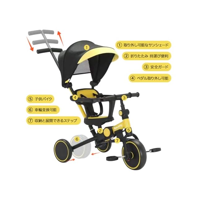 Bacany 子供用三輪車 7in1 三輪車 ステップ付き 折りたたみ 手押し棒 おしゃれ 1歳-6歳 ランニングバイク コンパクト 自転車 おもちゃ 乗用玩具 幼児用 キッズバイク プレゼント おもちゃ 調整可能 お祝い ギフト シートベルト付き (イエロー) | つむぎ屋