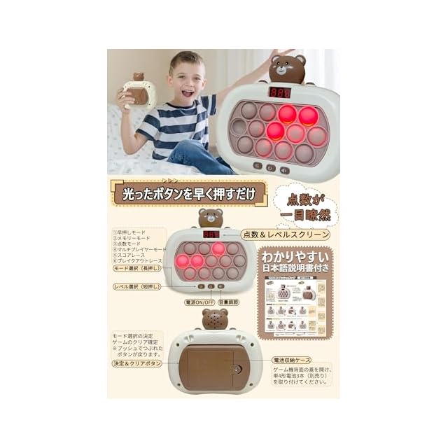 【大人気の知育玩具】もぐらたたきゲームおもちゃは、押しボタン式バブルゲームとエレクトロニックゲームを組み合わせています!電子ポップライトアップゲ一ムは楽しいクリックと動感のリズムで反応カ、手目協調能カ、記憶カ、論理思考能カを鍛えることができ。知育と頭脳ゲ一ムが好きな子供と大人にぴったりです。